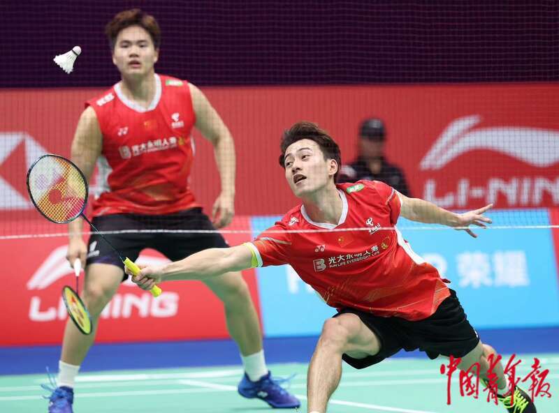 11月26日,广东深圳,深圳湾体育中心,2023李宁·中国羽毛球大师赛男子双打决赛中,王昶(前)在回球。中国组合梁伟铿/王昶气势如虹,以2:1战胜印度组合谢提/兰基雷迪,获得男双冠军。刘占崑/摄
