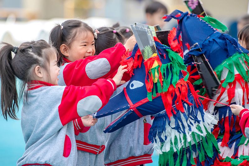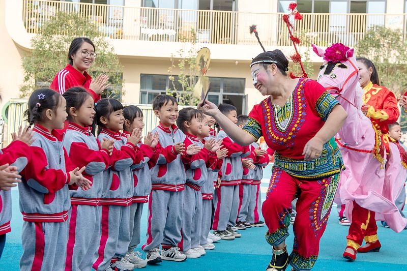2023年11月27日,浙江省湖州市长兴县泗安镇中心幼儿园,孩子们学习非遗竹马舞中的道具“竹马”相关知识。