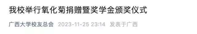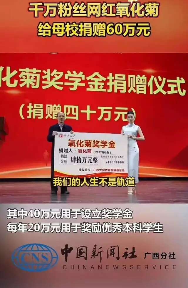 氧化菊此次向母校捐赠60万元其中40万元用于设立广西大学“氧化菊奖学金”连续两年每年20万元用于奖励广西大学各专业综测成绩排名前列的优秀本科学生