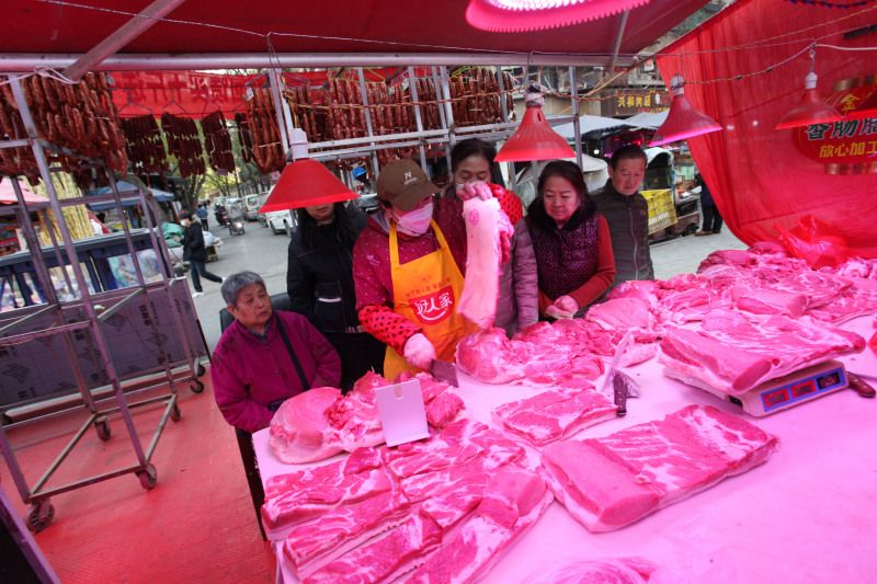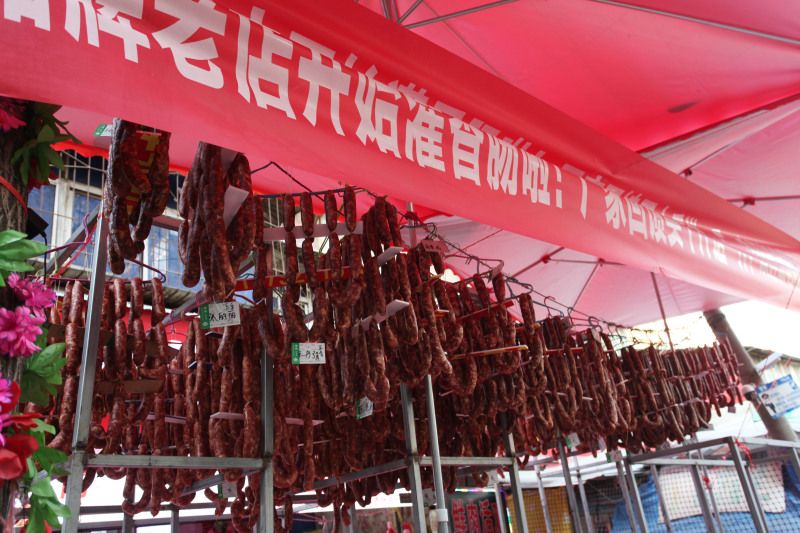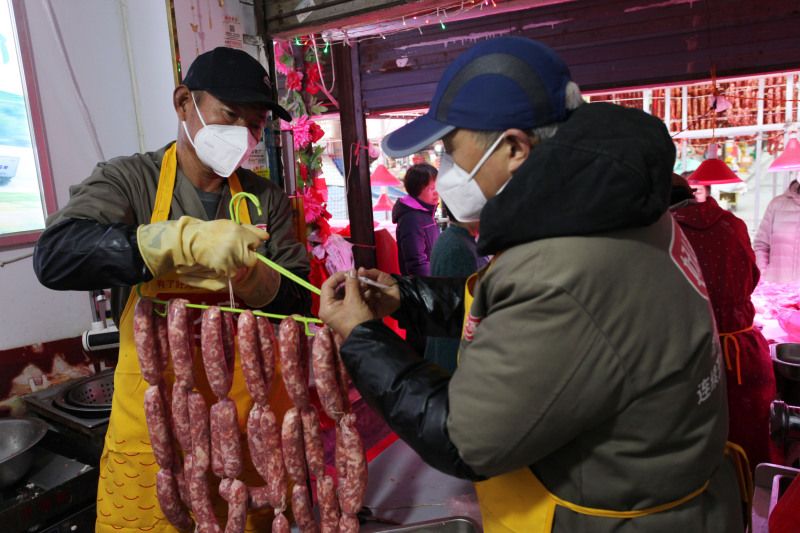 2023年11月28日,西安市北郭门,市民在肉店买肉灌香肠,有人一次就灌了132斤香肠,花了2160元。小雪节气后,不少市民开始灌香肠了,猪肉销售进入旺季。在北郭门这条小巷买了28年肉,灌了19年香肠的肉店女老板说,灌香肠一直要忙到过年,一个冬季要灌2万多斤香肠。