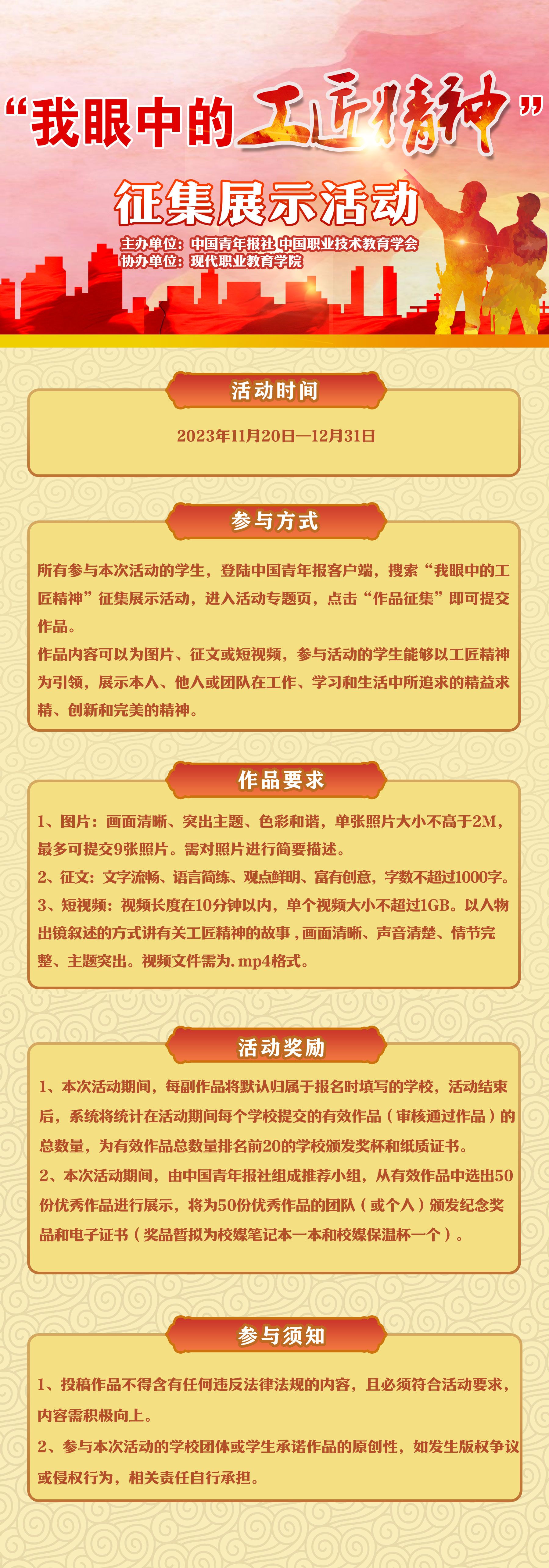 为了进一步推广工匠精神,展示大学生在工匠精神方面的成果和风采,中国青年报社联合中国职业技术教育学会面向大学生发起“我眼中的工匠精神”征集展示活动,现代职业教育研究院作为协办单位。