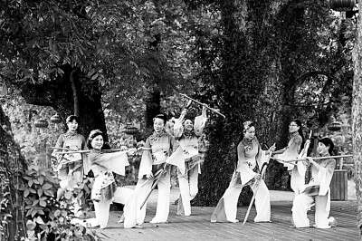 江西省宜黄县属山区,过去常有猛兽出没,人们上山砍柴时,用镰刀敲打禾杠并吆喝同伴以吓退猛兽。后来,吆喝声渐渐演变成矮腔山歌《卓望山歌》,敲打禾杠的动作演变成《禾杠舞》。图为宜黄县群众文化工作者跟随《卓望山歌》的节奏表演《禾杠舞》。喻建敏摄/光明图片