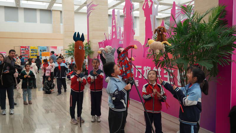 非遗研学集市展区,学生们展示自己创作的研学作品。上海井上书文化发展中心供图