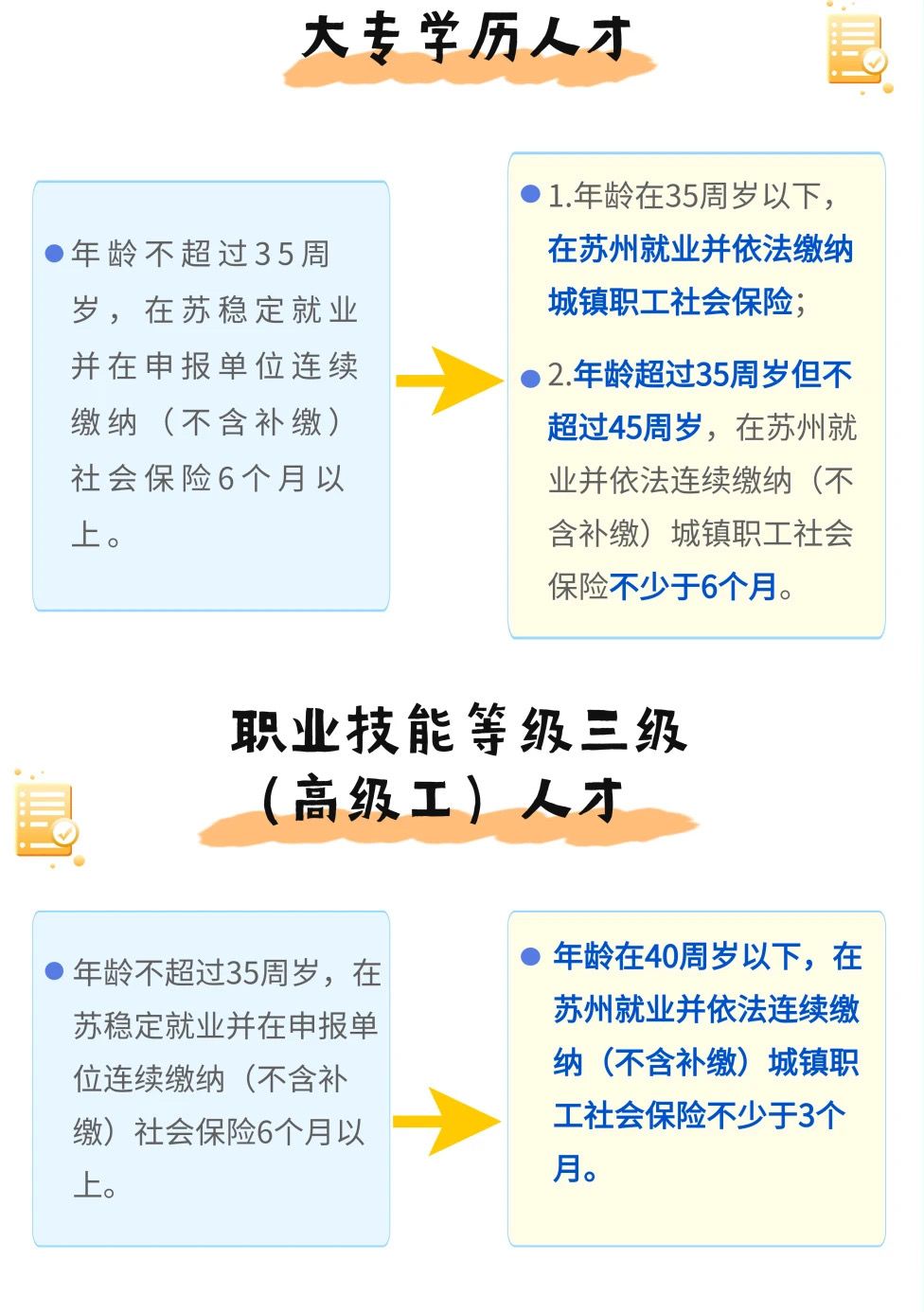 2.符合我市引进技能人才紧缺(工种)目录的职业技能等级三级(高级工)社保缴费年限、年龄放宽:年龄条件从35周岁放宽至40周岁,连续缴纳社保时间从6个月缩减为3个月。