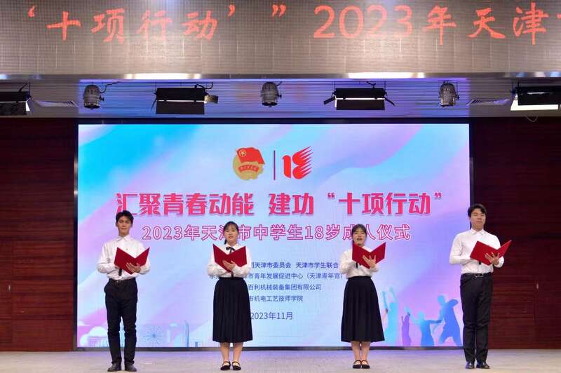 11月28日下午,“汇聚青春动能 建功’十项行动’”2023年天津市中学生18岁成人仪式在天津市机电工艺技师学院举办。近400名学子跨过“成人门”,迎接美好的18岁。
