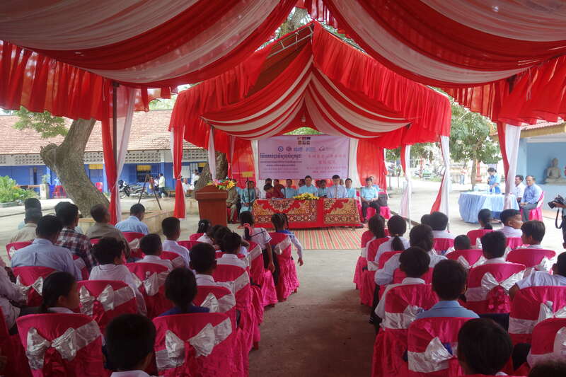 柬埔寨民间社会组织联盟论坛主席、柬埔寨首相府办公厅副主任盖里维希,柬埔寨茶胶省副省长凯亚索福,中国乡村发展基金会项目工作人员,项目受益学生、学生家长、学校教师等近200人参加本次活动。