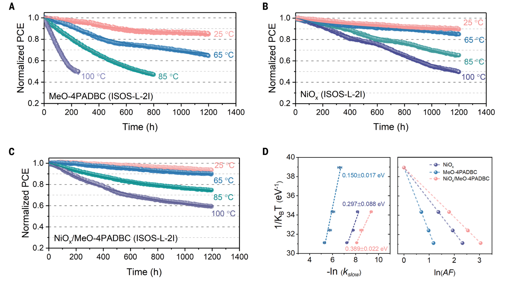 国科大材料科学与光电技术学院教授郑晓鹏团队等将MeO-4PADBC SAM分子锚定在氧化镍纳米粒子(NiOx NPs)薄膜表面,增强了空穴提取界面的稳定性,为设计稳定的空穴提取界面提供了指导,推动钙钛矿光伏向产业化发展。