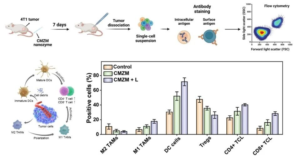 中国科学院精密测量科学与技术创新研究院团队设计开发了一种具有多重纳米酶活性的纳米探针,实现4T1肿瘤的1H/19F双核磁共振/荧光多模态精准检测,可通过多重纳米酶级联反应提高ROS产量,激活肿瘤免疫应答,提高4T1肿瘤的免疫治疗效果。