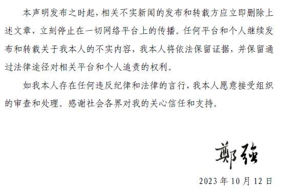 郑强就此发布声明,账号“华趣”所发布的全部文字与图片内容均为恶意编造、虚构的不实信息,已向警方报案。全文如下——