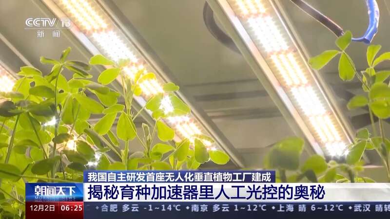 记者在垂直植物工厂里看到,作物上面密密麻麻布满了LED光源。专家告诉记者,这些人工光源,模拟和替代了自然光。而加快作物发育和育种过程,就是通过精准控制光的亮度和颜色来实现的。
