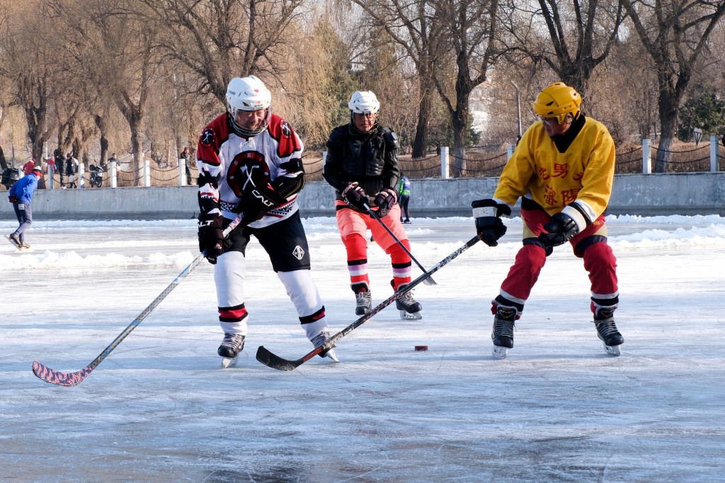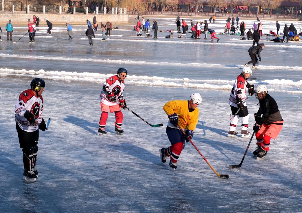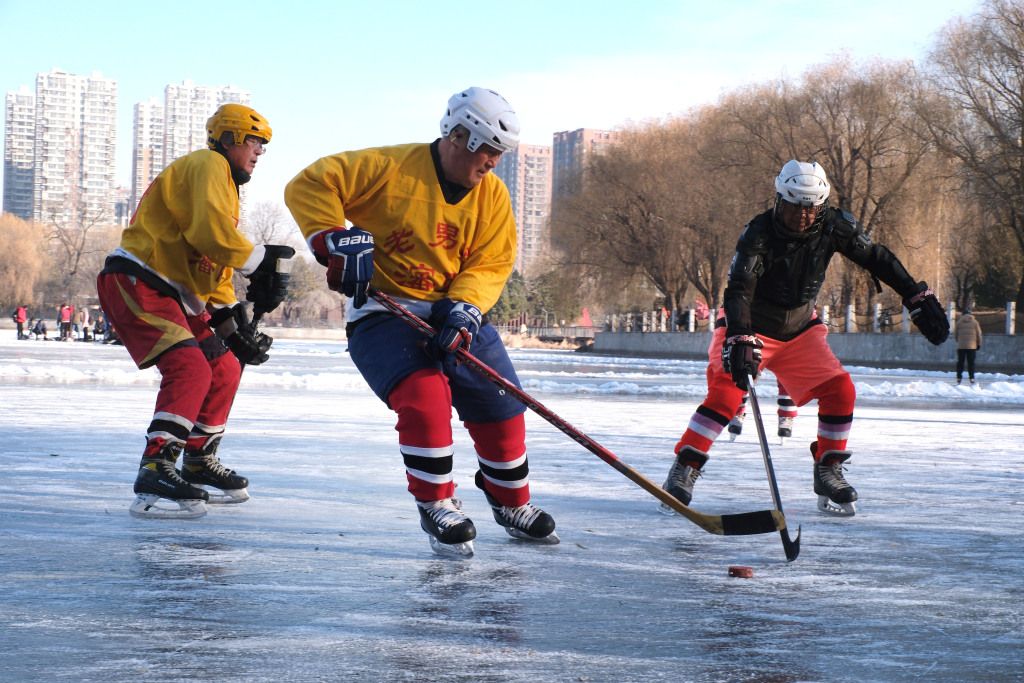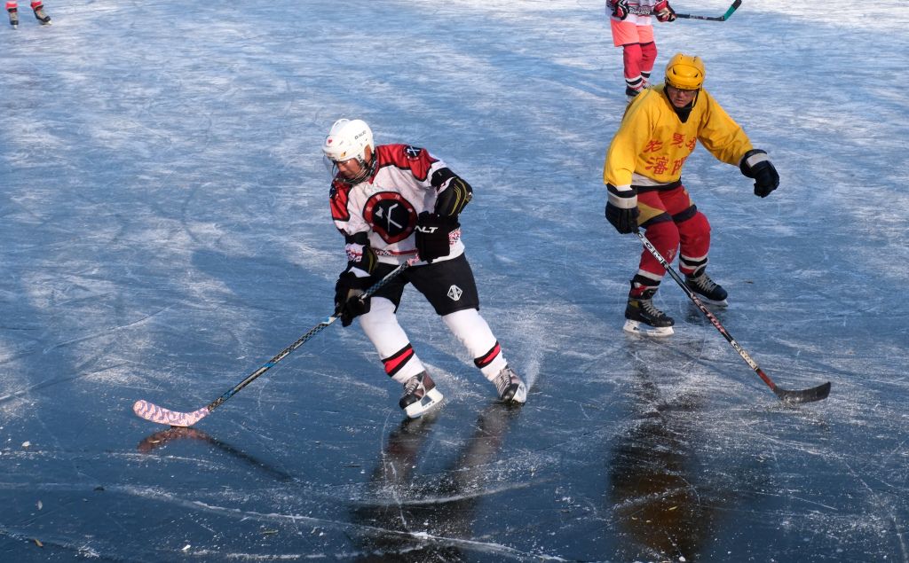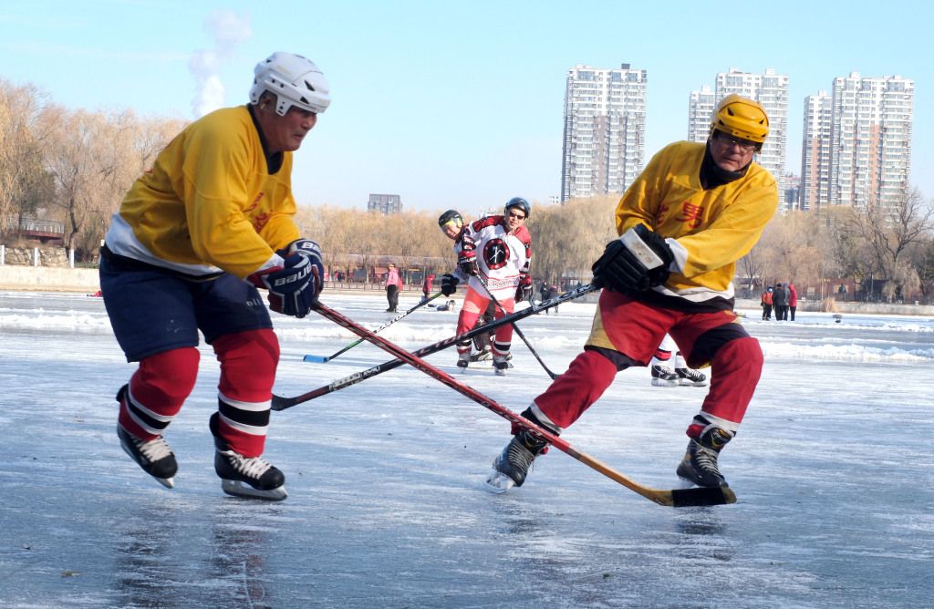 2023年12月2日,沈阳,一群老年人正在铁西区劳动公园人工湖冰上打冰球健身,乐享冰上运动。