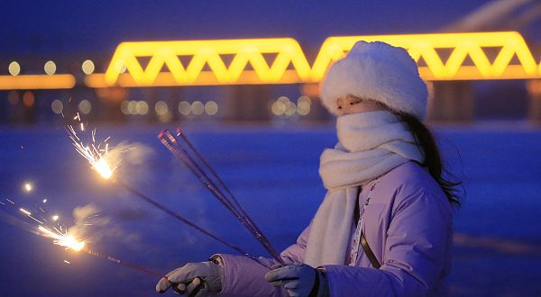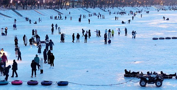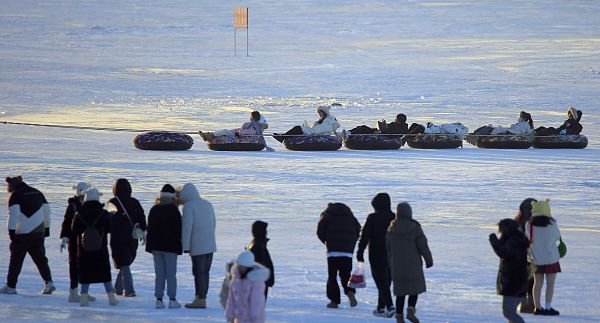 2023年11月30日,哈尔滨,-20℃的严寒中,冰冻的松花江宛如冷库,让人的体感温度接近-30℃。真实的冰,厚厚的雪,让这里成为巨大的磁石,吸引着大量的游客汇聚而来。雪圈、爬犁、烟花,南方游客在冰天雪地中放飞自我,阿姨们坐在冰上打卡,孩子趴在冰上舔舐,北国的寒冷,成为他们体验新奇的游乐园。