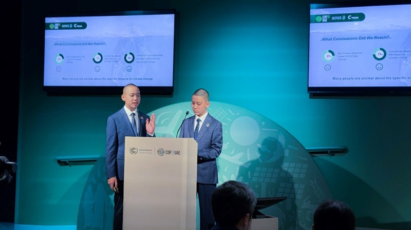 第28届联合国气候变化大会(《联合国气候变化框架公约》第二十八次缔约方大会,COP28)“运河城市:气候变化风暴眼”主题边会12月3日召开。两位12岁中国深圳少年李秉宸、李秉恒分享了他们发起的关于青少年对于气候变化认知的调研成果,呼吁加强对青少年的宣传教育,表示将从自身做起,积极影响身边的人共同参与到应对气候变化的行动中来。两位少年的演讲,获得全场起立热烈鼓掌。