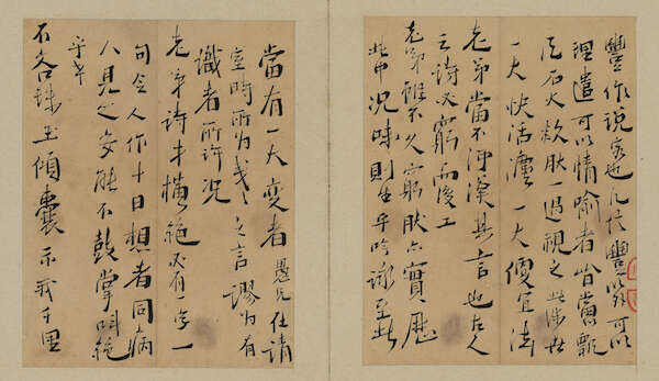 薛龙春:字体杂糅有很多种定义。在北朝后期,杂合篆书、隶书与楷书于一碑的情况很多,如《李仲璇修孔子庙碑》,学者们的解释各不相同。但我这里说的杂糅不是杂合,是指一件作品有明确的字体,只不过其用笔或结构糅合了其他字体的一些特征。在本书第一章中,我从王铎、周亮工这对师生对字体杂糅的兴趣展开讨论,指出周亮工既受到王铎的影响,也有别树一帜之意,不同于王铎以楷书、隶书的用笔来书写篆书的字形,周亮工写楷书时有意识地将隶书的用笔、结构揉入其中,并自称这是隶书向楷书过渡阶段可能的样态,所谓“以分为楷”(图五)。这是我偶然从一封书信中看到的,这封书信没有上款人,但我考证是写给王弘撰的,王弘撰作书笔笔有来历,但他对周这样的楷书却非常赞赏,周亮工也将他视为解人,认为“老鬼伎俩”被他勘破。到了碑学中兴以后,包世臣鼓吹邓石如“移篆分以作今隶(楷书)”,何绍基明确地主张“化篆分入楷”。不过何绍基不用像周亮工这样去想象隶楷过渡时期的文字形貌,他认为南北朝碑刻就是隶、楷过渡时期的字体。学习魏碑,保证了楷书中的隶意,因此比唐楷更具古意。