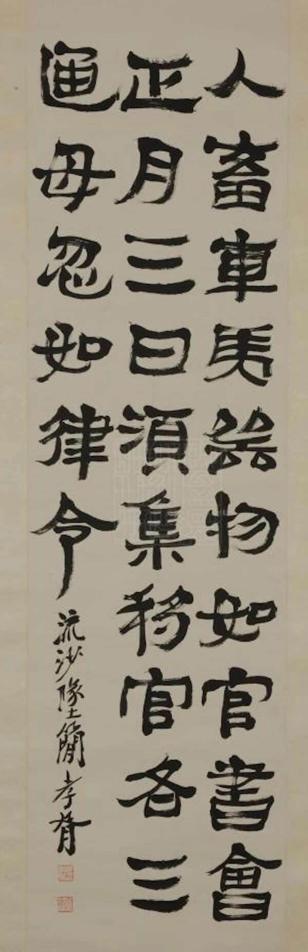 事实上,郑簠的隶书同样具有表演性,他甚至在写字之前还要放爆竹以提振意气。从他的书迹看,用笔沉着飞舞,移步换形,餍足了观众的期待。而隶书这一字体的历史距离感又让人感到新鲜。这大概就是时人眼中的“古”(图七)。郑簠的隶书以晚明大轴气象挥霍的用笔方式来表现汉碑意趣,与文徵明等人拉开了足够的差距。不过自康熙后期直到乾嘉,关于其隶书的批评日见严厉,其焦点正在于用笔节奏的铿锵,其时人们认为横平竖直的结构、平铺直叙的用笔才是隶书古意之所在,郑簠的隶书因而成为“不古”的反面教材。