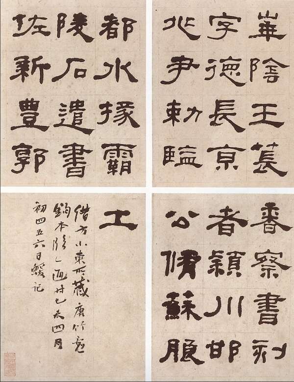 而碑刻拓本面临的分歧就更多,本身偏于静态的字形,难以推测其书写的速度与节奏,于是有人主张透过刀锋看笔锋,率意放笔;有人主张要用柔毫表现剥蚀感,刻画点画的边缘线……不同的时期人们会有不同的主张,比如乾嘉时期的隶书多点画光洁,而晚清的隶书则点画更显崎岖。书家们对古碑常有迥异的读解,充满了主观色彩,但他们都以“古”为标榜,那么,“古”到底指向什么样的形式趣味,便难有一致的意见。正是因为“揣摩性的临摹”,郑簠既是清初隶书“古”的象征,也是乾嘉时期所批判的“不古”的代表。碑学内部的这种分歧,与拓本作为范本有很大关系,更不用说以双钩本作为范本了。