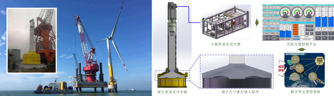 2022年初,东南大学机械工程学院倪中华、孙蓓蓓、严岩团队联合龙源振华,启动了3500kJ海洋大型液压打桩锤成套装备攻关,走出大型液压锤国产化第一步。结合龙源振华丰富的现场施工经验和装备使用心得,团队利用产学研联合攻关的技术优势,建立了大载荷冲击动力学及疲劳寿命预测模型、超大型锻件制造热处理工艺以及高精度沉桩过程数字孪生模型,通过工程数据确立模型核心系数,为大尺寸核心锻件(替打毡座、替打环)的轻量化设计与制造工艺定型奠定基础。