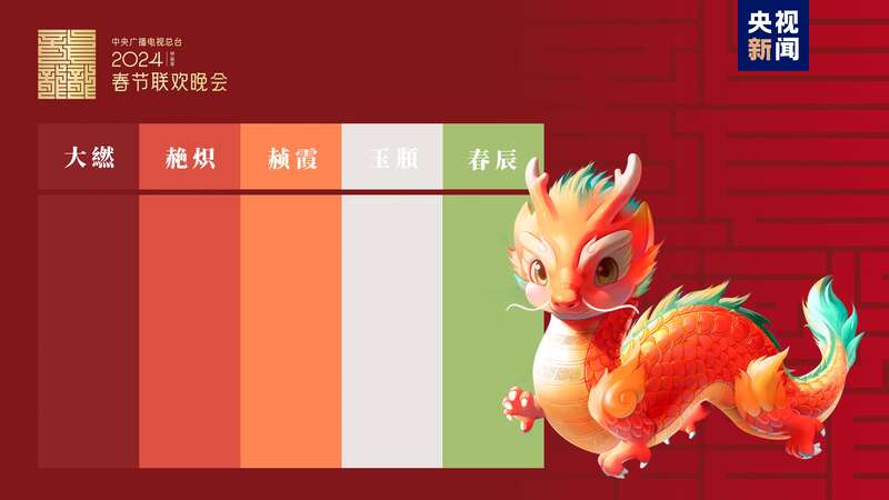 “龙辰辰”的配色选取了大繎、赩炽、赪霞、玉頩、春辰等中国传统色。“赪霞拂朝,苍烟懵夕”,赪霞色代表了红色的云霞,代表了旭日初升时霞光万丈的青春色彩。春辰是冰雪初融,草木萌动的颜色,它所属的青绿色系正是东方青龙的代表色。青龙是中国古代天文四象之一,代表着春天、希望和生长,也赋予了“龙辰辰”冬去春来、辞旧迎新的蓬勃生机。
