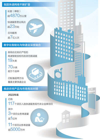 “经过多年快速发展,我国不仅是规模领先、业务活跃的快递市场,更成为全球快递发展的助推器。”王锡彬说,我国快递包裹业务量自2014年起稳居世界第一,去年快递包裹业务量超过1100亿件,业务收入破万亿元,成为我国经济恢复向好的生动写照。我国的快递网络不断扩容,如今已形成长度(单程)超过4870万公里、快递服务营业网点超23万处、日均服务超7亿人次的巨型网络。