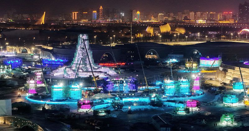 2023年12月6日,第二十四届哈尔滨冰雪大世界园区内,夜景璀璨,已经封顶的主塔,不断闪烁不同颜色的灯光,进行着调试。冰建工人、雪雕匠人、电工、特种设备操作工、技工、安全员、监理等近万人均在紧张有序地忙碌着。