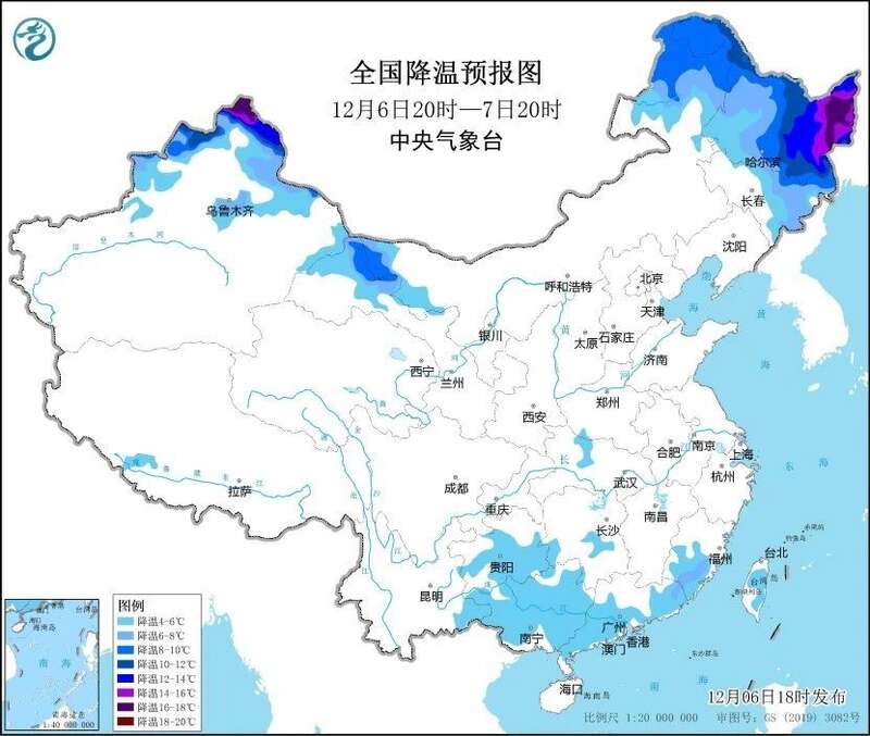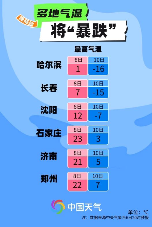像石家庄、济南、郑州后天最高气温超过20℃,周日将暴跌至5℃左右。哈尔滨、长春后天最高气温在0℃以上,周日暴跌至不足-10℃。