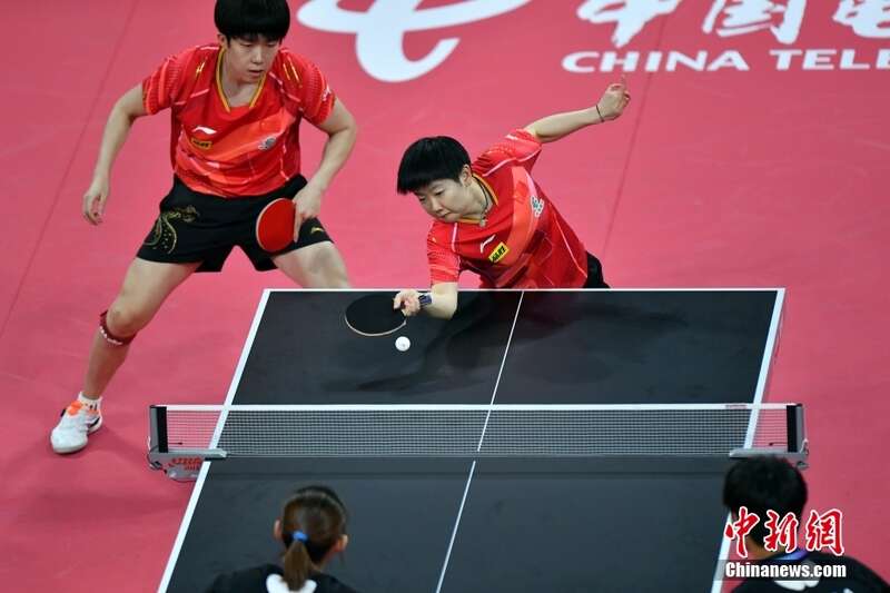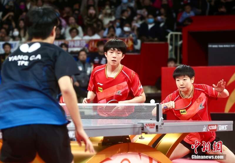 中新社记者 王磊 摄 在混合双打比赛中,中国队组合王楚钦/孙颖莎2比1战胜中国台北队组合杨嘉安/李昱谆。图为王楚钦(左)、孙颖莎在比赛中。