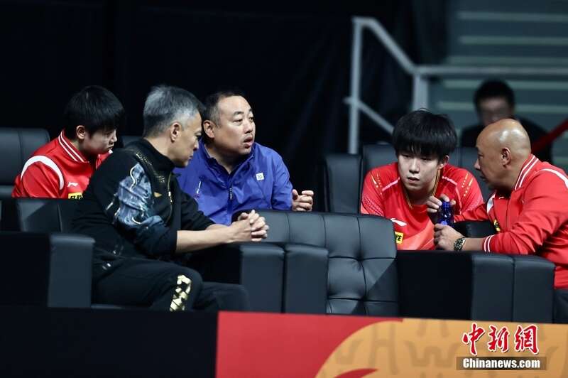 中新社记者 易海菲 摄 混双比赛后,中国乒协主席刘国梁(中)和中国队球员王楚钦(右二)、孙颖莎(左一)交流。