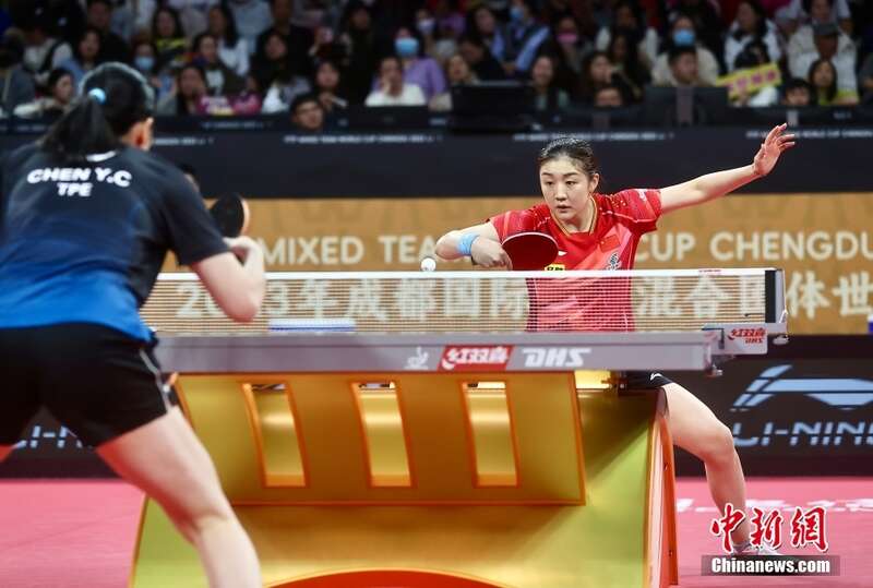 中新社记者 易海菲 摄 12月7日,在四川成都举行的2023年国际乒联混合团体世界杯第二阶段的比赛中,中国队8比1战胜中国台北队。在混合双打比赛中,中国队组合王楚钦/孙颖莎2比1战胜中国台北队组合杨嘉安/李昱谆。图为王楚钦(中)、孙颖莎(右)在比赛中。