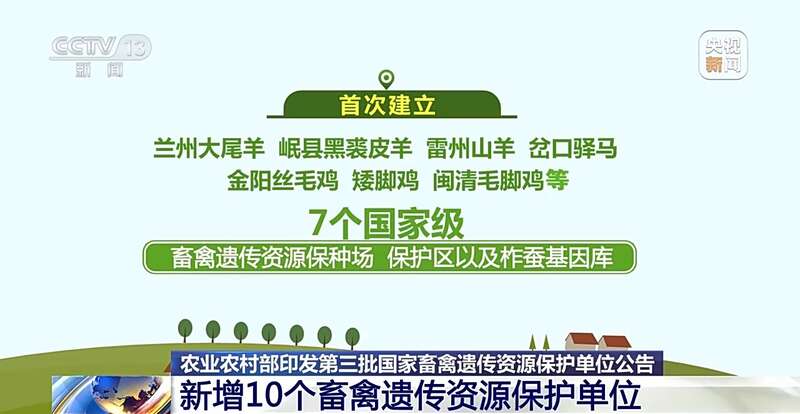 这10个畜禽遗传资源保护单位包括8个保种场、1个保护区和1个基因库。其中,首次建立了兰州大尾羊、岷县黑裘皮羊、雷州山羊、岔口驿马、金阳丝毛鸡、矮脚鸡、闽清毛脚鸡等7个国家级畜禽遗传资源保种场、保护区以及柞蚕基因库。至此,国家畜禽遗传资源保护体系对159个国家级畜禽遗传资源保护品种实现活体保护全覆盖。