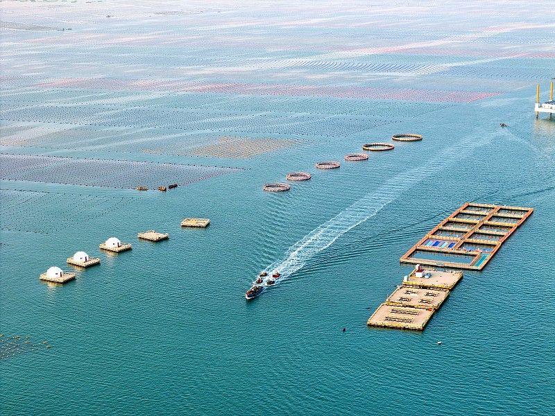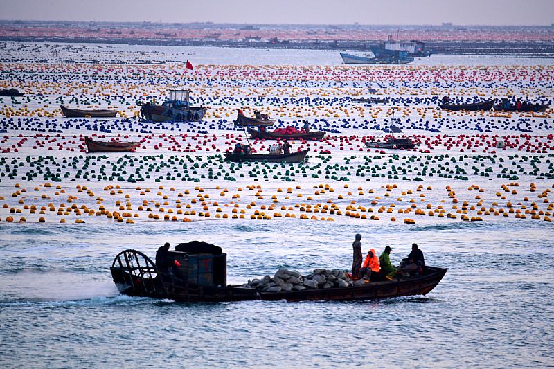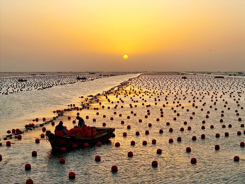 2023年12月7日晨曦,山东省荣成市,大雪时节,爱伦湾海洋牧场,渔民披着朝阳驾驶船只投入海带养殖作业,船只穿梭于海面之上,一派繁忙景象。