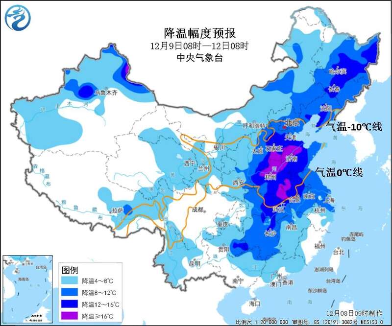 预计9日至11日,受较强冷空气影响,东北地区、华北、黄淮、江汉、江淮、江南西部和北部等地气温下降6~10℃,东北地区中部、华北南部、黄淮等地降温幅度可达12℃以上;12日早晨,最低气温0℃线将南压到湖北中部至苏皖北部一带。其间,长江以北大部地区有4~6级偏北风,阵风7~8级;渤海、黄海、东海海域有5~7级风、阵风8~9级。