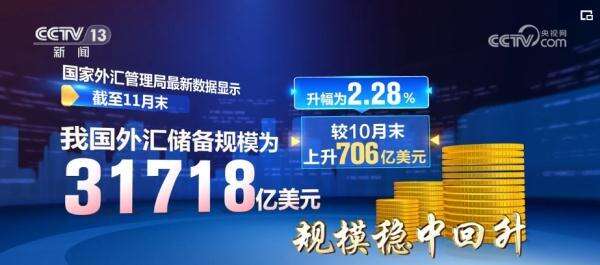 国家外汇管理局最新数据显示,截至11月末,我国外汇储备规模为31718亿美元,较10月末上升706亿美元,升幅为2.28%,规模稳中回升。