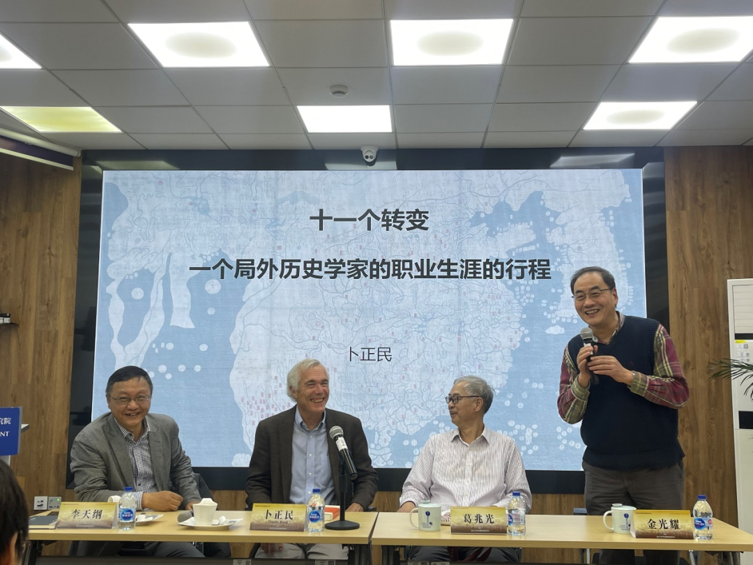 11月23日下午,卜正民回到复旦大学,与他的一众老友如葛兆光和金光耀、李天纲等历史学人叙旧,做了讲座《十一个转变:一个局外历史学家的职业生涯的行程》。这十一个转变,包括“从宗教史到社会史”“从国家行政史到地方社会史”“从国家史到全球史”“从接触史到相互参与史”“从国家史到全球气候史”等,卜正民认为他的经验不能完全代表西方汉学界,但他的转变参与了许多海外汉学研究的潮流变迁。