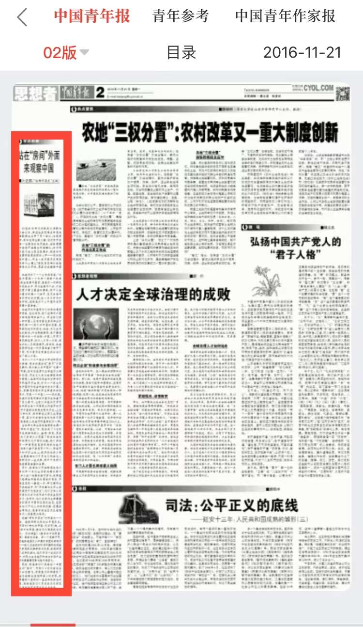 2016年11月21日,《中国青年报》“思想者”版刊发卜正民教授为6卷本《哈佛中国史》撰写的中文版总序。供图:《中国青年报》电子版截图