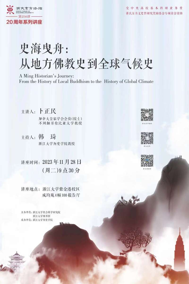卜正民教授11月28日在“浙大东方论坛”的演讲海报。供图:浙江大学社会科学研究院