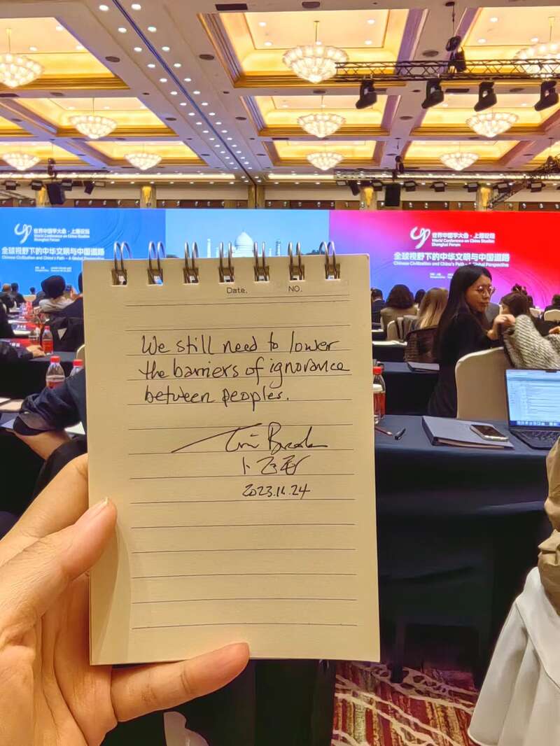 “We still need to lower the barriers of ignorance between peoples(我们仍然需要减少不同文化边界的局内人因为无知所构建的相互理解的壁垒)。”2023“世界中国学大会·上海论坛”11月23日至24日在黄浦江畔举行,作为论坛80名志愿者之一,上海外国语大学英语口译专业硕士二年级学生周子涵获赠了这样一条寄语,她请此次陪同的加拿大籍世界著名历史学家和汉学家卜正民(Timothy Brook)教授把寄语签在了口译竖翻本上。