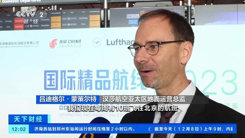 汉莎航空亚太区地面运营总监 吕迪格尔・蒙策尔特:我们现在每周有10班飞往北京的航班,有48班飞往中国各地,服务于北京、上海和香港的国际机场。进入2024年,我们一定会进一步增加航班数量,并计划将每周40多班增加到每周60多班。