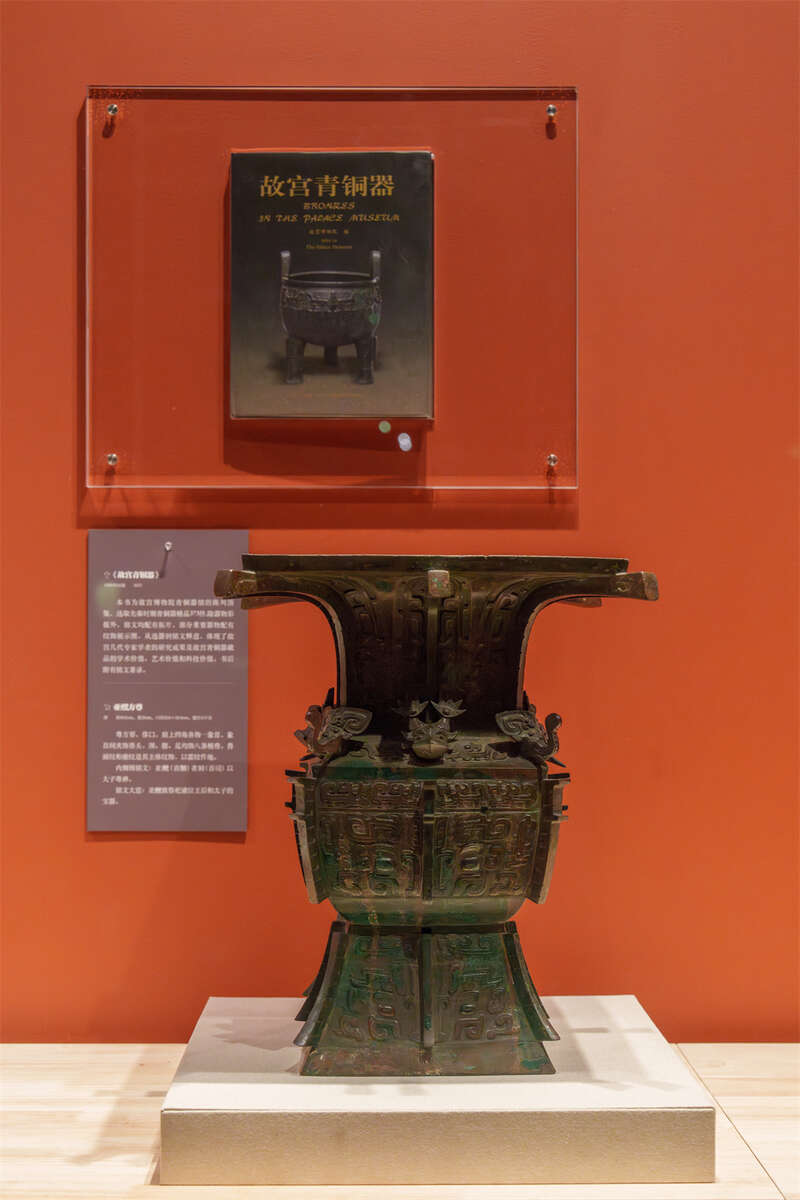 进入展厅,两个由故宫出版社出版物堆成的“故宫书山”和“紫禁书城”,分别使用了午门与太和殿造型,高1.65米,总用书量达3323本。后殿展出22件院藏重要文物,包括青铜器、五大名窑瓷器、清宫首饰、钟表、玉器、玺印、古琴等。其中18件与展出的历史出版物一一对应。