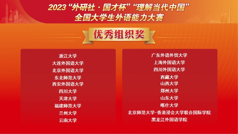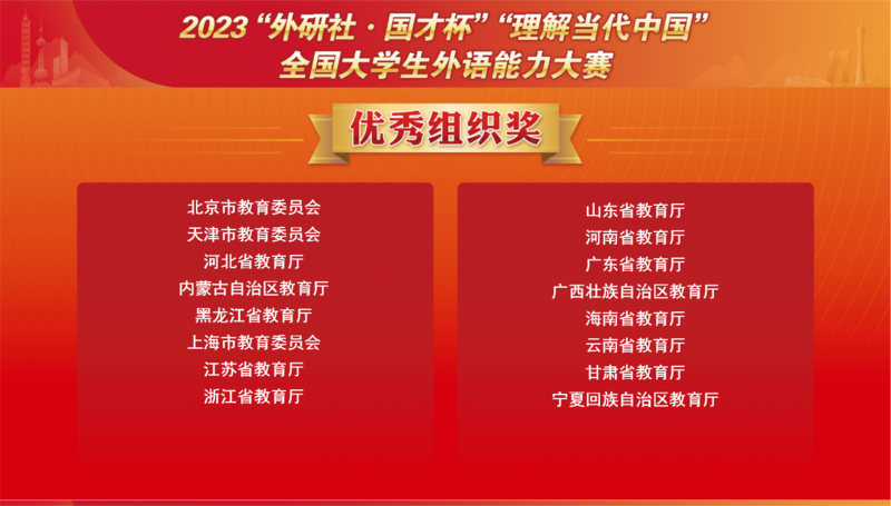 本次大赛为在比赛过程中指导支持组织大赛、提升大赛影响力的省级教育行政部门,以及为国赛成绩显著、省赛承办组织工作成效突出的高等院校颁发优秀组织奖,并向20多年来为大赛提供支持、促进大赛不断发展的各地外语研究会致以敬意。