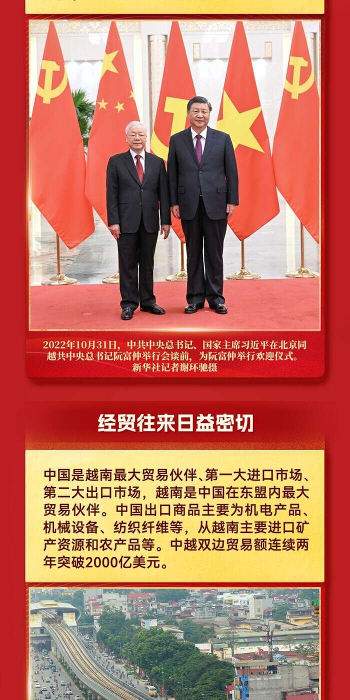 应越南共产党中央委员会总书记阮富仲、越南社会主义共和国主席武文赏邀请,中共中央总书记、国家主席习近平将于12月12日至13日对越南进行国事访问。