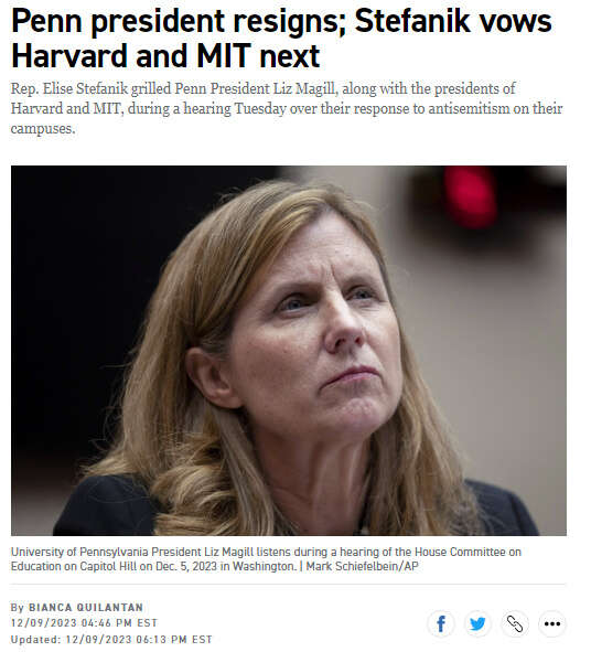 另据报道,74名国会议员,主要是共和党人,日前联名致信敦促这三家大学开除其校长,原因是他们未能解决校园里的反犹主义问题。