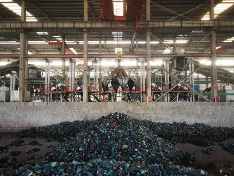 走进位于沭阳县的江苏天能资源循环科技有限公司生产区,一只硕大的抓斗将回收池内的废旧铅蓄电池挪至粉碎机中,经破碎、熔炼等处理后可得到三样产品:铅、塑料和硫酸,这些都是制造新电池的原材料。