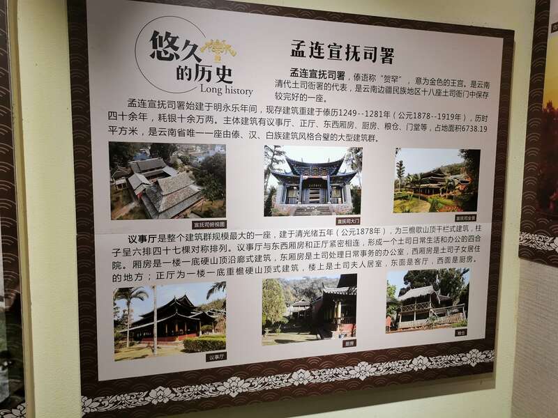 中国青年报客户端讯(中青报·中青网记者 何春中)云南省孟连县民族历史博物馆是以孟连宣抚司署为馆址的地方史类博物馆,是展示孟连土司文化、历史文化的重要窗口,隶属于孟连傣族拉祜族佤族自治县文化和旅游局。该博物馆位于娜允傣族历史文化名镇内,占地面积6738.19平方米,建筑面积 1799.30平方米,现为国家三级博物馆、国家3A级旅游景区、云南省科普教育基地、云南省爱国主义教育基地。