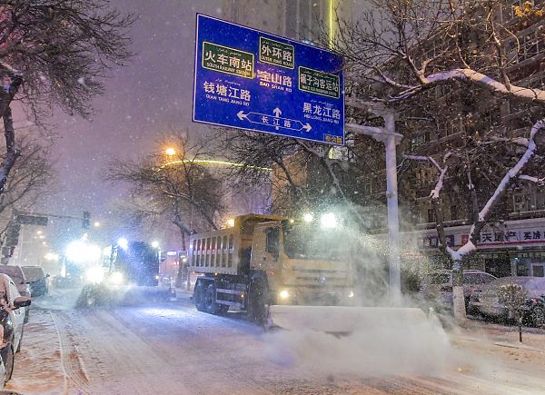 2023年12月12日晚,新疆乌鲁木齐市奇台路,该市沙依巴克区城市清运队的大型清雪车对城市道路进行清扫。受冷空气影响,乌鲁木齐市出现持续降雪天气,该市出动大型机械设备,避开交通高峰期,连夜对城市道路进行清理,保障城市交通。 中新社记者 刘新 摄