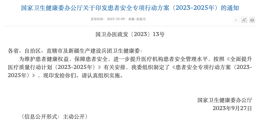 今年9月,国家卫生健康委制定并发布了《患者安全专项行动方案(2023-2025年)》,该方案明确,要提高对信息安全的重视程度,防止数据泄露、毁损、丢失,严禁任何人擅自向他人或其他机构提供患者诊疗信息。
