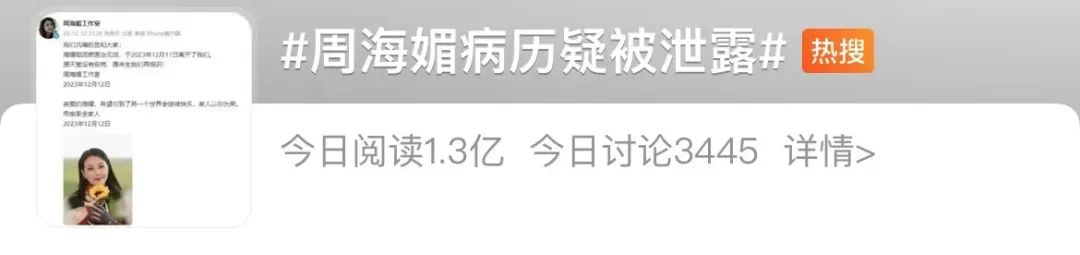 随后,疑似周海媚生前送医院抢救的电子病历截图在网上被流传,病历上显示医院为北京中医医院顺义医院,并记载了周海媚个人资料、就诊时间等相关信息。此事引发热议。