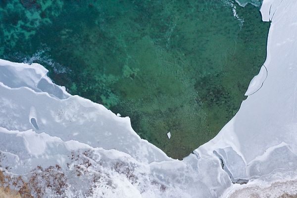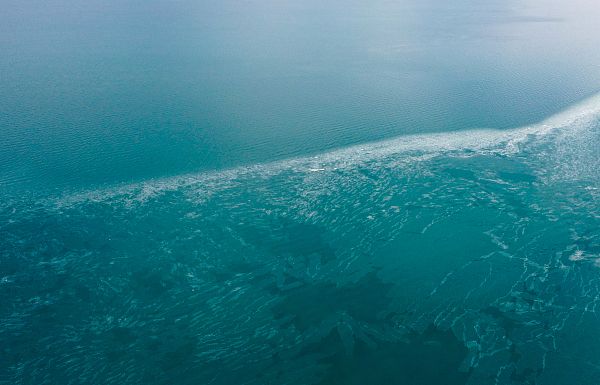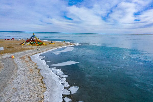 2023年12月13日,青海海南州,共和县境内的青海湖已由岸边向湖心渐次封冻。近日,享有“高原蓝宝石”美誉的青海湖已进入冰封季,冰块如破碎的水晶漂浮在湖面上,成为冬日青海湖奇特景观。(无人机照片) 中新社记者 马铭言 摄