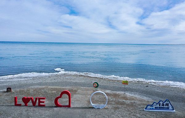 2023年12月13日,青海海南州,共和县境内的青海湖,湖面上漂浮的冰块如同破碎的水晶。近日,享有“高原蓝宝石”美誉的青海湖已进入冰封季,冰块如破碎的水晶漂浮在湖面上,成为冬日青海湖奇特景观。(无人机照片) 中新社记者 马铭言 摄