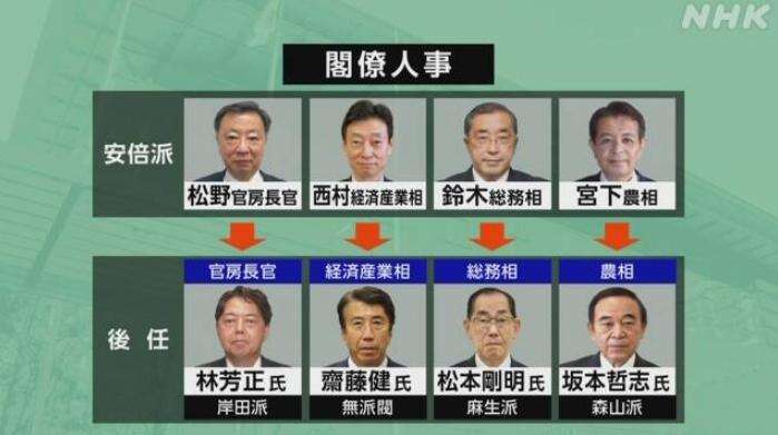 据报道,岸田将会把官房长官、经产相、总务相和农相四个重要职位换人,此前任外相的林芳正将接替松野博一担任官房长官,经产相、总务相和农相将分别由斋藤健、松本刚明和坂本哲志担任。四人均不属于安倍派成员。