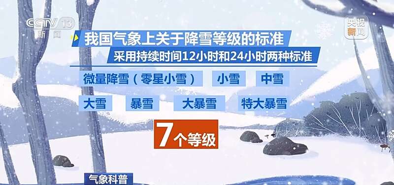 我国气象上关于降雪等级的标准,将降雪分为微量降雪,也就是零星小雪、小雪、中雪、大雪、暴雪、大暴雪、特大暴雪共7个等级。该标准一般采用持续时间12小时和24小时两种标准。